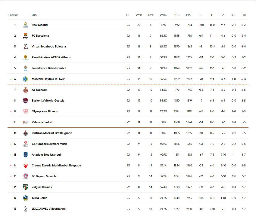 Βαθμολογία Euroleague σε 23 αγωνιστικές