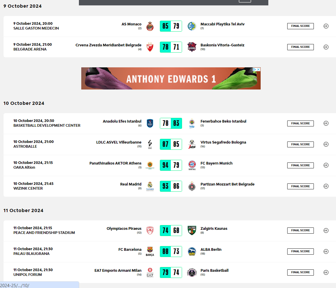 Στα άλλα παιχνίδια της ημέρας η Αρμάνι νίκησε στο Μιλάνο την Παρί με 88-73 και πέτυχε επίσης την πρώτη της νίκη στην Ευρωλίγκα, όπως και η Μπαρτσελόνα μετά την επικράτησή της στη Βαρκελώνη με 88-73 κόντρα στην Άλμπα Βερολίνου.
