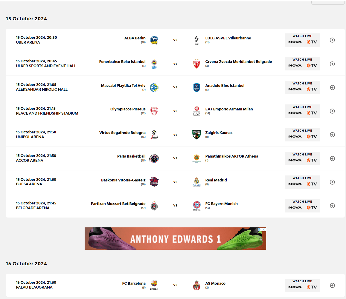 Οσο για τις ελληνικές ομάδες ο Ολυμπιακός υποδέχεται στις 21:15 την Αρμάνι Μιλάνο, ενώ 15 λεπτά αργότερα ο Παναθηναϊκός δοκιμάζεται στο Παρίσι από την Παρί.