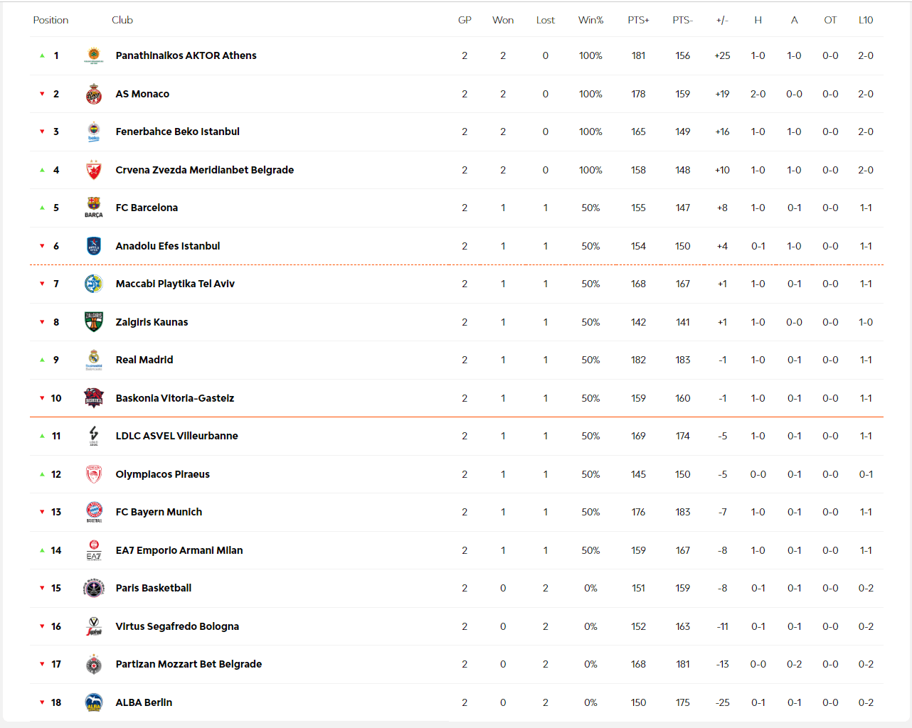 Έτσι διαμορφώθηκε η βαθμολογία στη Euroleague μετά την ολοκλήρωση της 2ης αγωνιστικής.