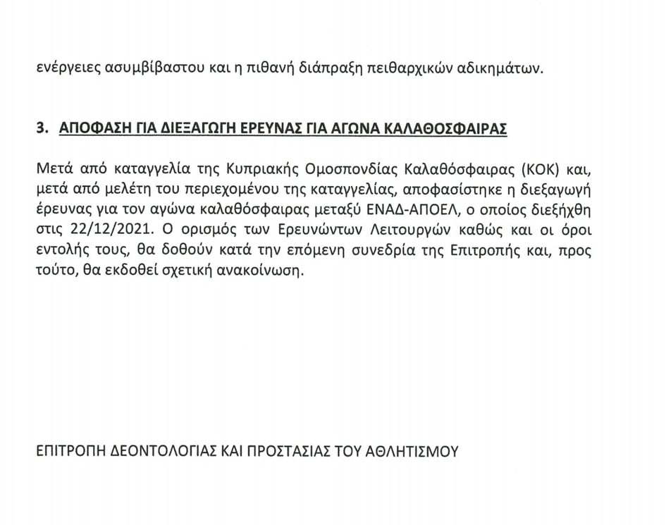 Σας παρουσιάζουμε την απόφαση όπου αναγγέλλει τη διεξαγωγή έρευνας για το συγκεκριμένο αγώνα!