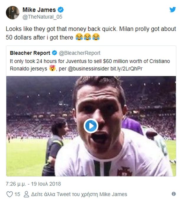 Το ποσό που έχει εξασφαλίσει η Γιουβέντους από τη στιγμή που κυκλοφόρησαν οι φανέλες του Κριστιάνο Ρονάλντο σχολίασε ο Μάικ Τζέιμς. Συγκεκριμένα, ο 27χρονος Αμερικανός έκανε ένα tweet με αρκετή δόση χιούμορ: «Φαίνεται πως θα πάρουν (στην Γιουβέντους) πολύ γρήγορα το ποσό που ξόδεψαν. Η Αρμάνι Μιλάνο, έβγαλε περίπου 50 δολάρια από την στιγμή που...