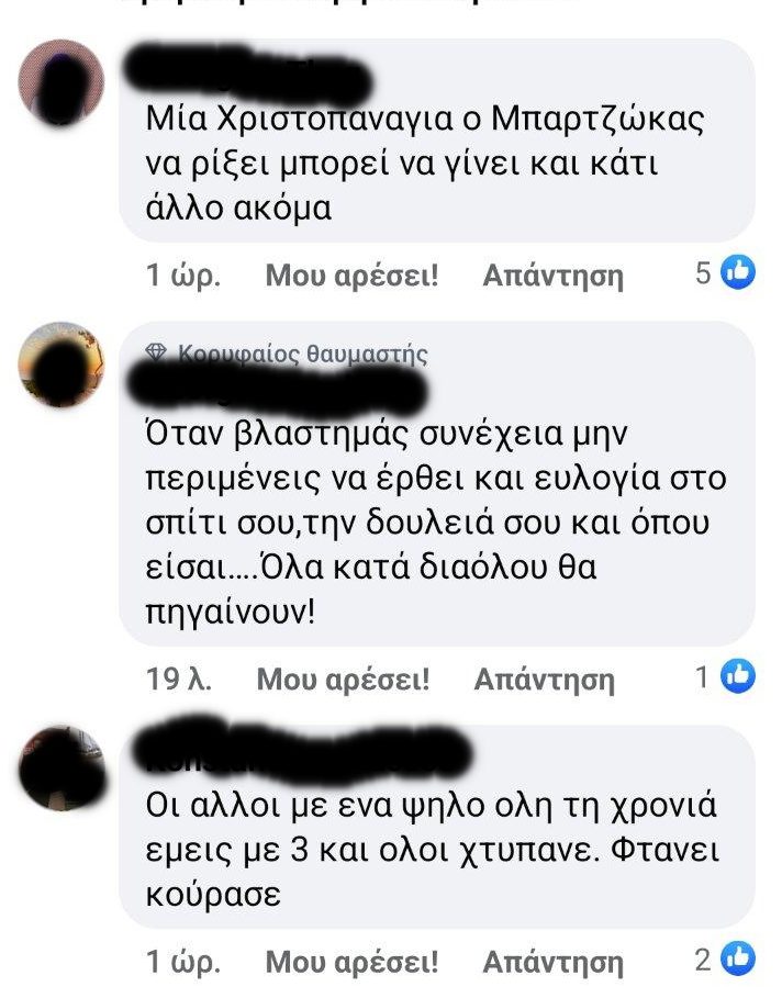 «Όταν βλασφημάς συνέχεια, μην περιμένεις να έρθει ευλογία στη δουλειά σου. Όλα θα πηγαίνουν κατά διαόλου», έγραψε ένας φίλαθλος του Ολυμπιακού σε ομάδα του Facebook. «Αυτά παθαίνεις όταν βρίζεις τα θεία από το πρωί ως το βράδυ», έγραψε ένας άλλος.«Μπαρτζώκα, άσε την Παναγία ήσυχη, πολλά αρνητικά μαζεύεις», έγραψε άλλος. Δεκάδες τέτοια σχόλια. Πολύς κόσμος έχει αρχίσει να δυσανασχετεί.