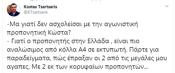 Για μια ακόμα φορά ο Κώστας Τσαρτσαρής «χτύπησε» μέσω Twitter. Όπως έχω ξαναγράψει (και το έχω πει και στον ίδιο) θα τον προτιμούσα περισσότερο ενεργό στο… γήπεδο παρά στα social media. Και γι’ αυτό διαφωνώ μαζί του στην τακτική που έχει ακολουθήσει.