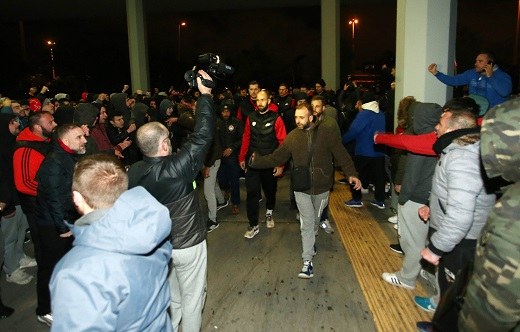 Οι φίλοι του Ολυμπιακού αποθεώνουν την ομάδα κατά την άφιξή της στο ΣΕΦ και μετά την αποχώρηση από το ΟΑΚΑ στις 13 Φεβρουαρίου του 2019