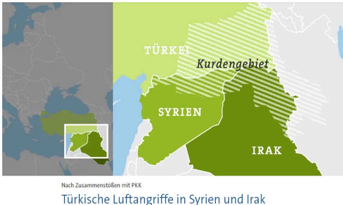 Το γερμανικό μέσο ενημέρωσης Tagesschau δημοσίευσε τον χάρτη με το «Κουρδική περιοχή» (Κουρδιστάν) που περιλαμβάνει τμήματα της Τουρκίας, της Συρίας, του Ιράκ και του Ιράν.