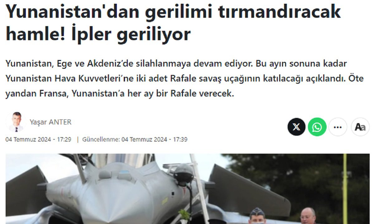 Ένα Rafale το μήνα θα παίρνει η Ελλάδα, σύμφωνα με τουρκικά δημοσιεύματα, τα οποία επικαλούνται ελληνικά ΜΜΕ, με τους Τούρκους να τονίζουν πως η Ελλάδα με… αυτά που κάνει προκαλεί και αυξάνει την ένταση στην περιοχή.