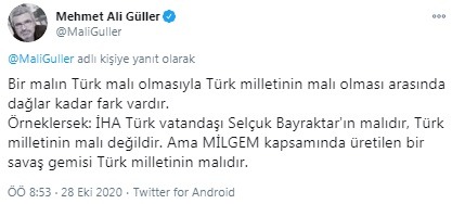 «Υπάρχει μια τεράστια διαφορά μεταξύ μιας ιδιοκτησίας που είναι τουρκική ιδιοκτησία και της ιδιοκτησίας του τουρκικού έθνους. Για παράδειγμα: Το UAV είναι ιδιοκτησία του Τούρκου πολίτη Σελτζούκ Μπαϊρακτάρ, όχι του τουρκικού έθνους», ανέφερε ο Τούρκος συγγραφέας και αναλυτής. «Ένα πολεμικό πλοίο που παράγεται από την πολιτεία είναι ιδιοκτησία του τουρκικού έθνους», σημείωσε.