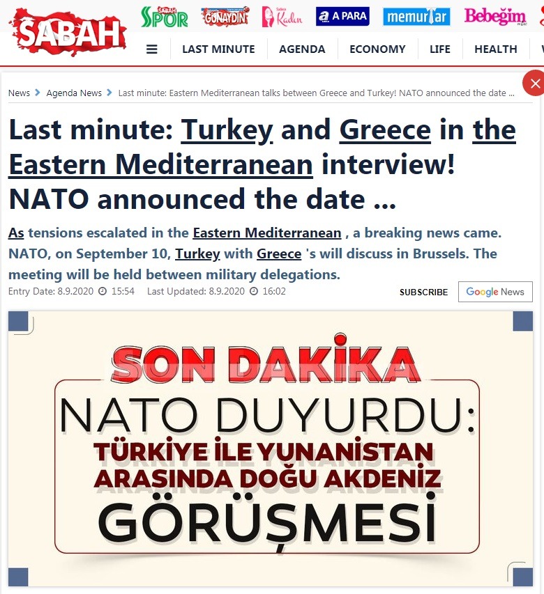 Τουρκικός Τύπος: «Το ΝΑΤΟ ανακοίνωσε συνάντηση Ελλάδας-Τουρκίας την Πέμπτη (10/9)»