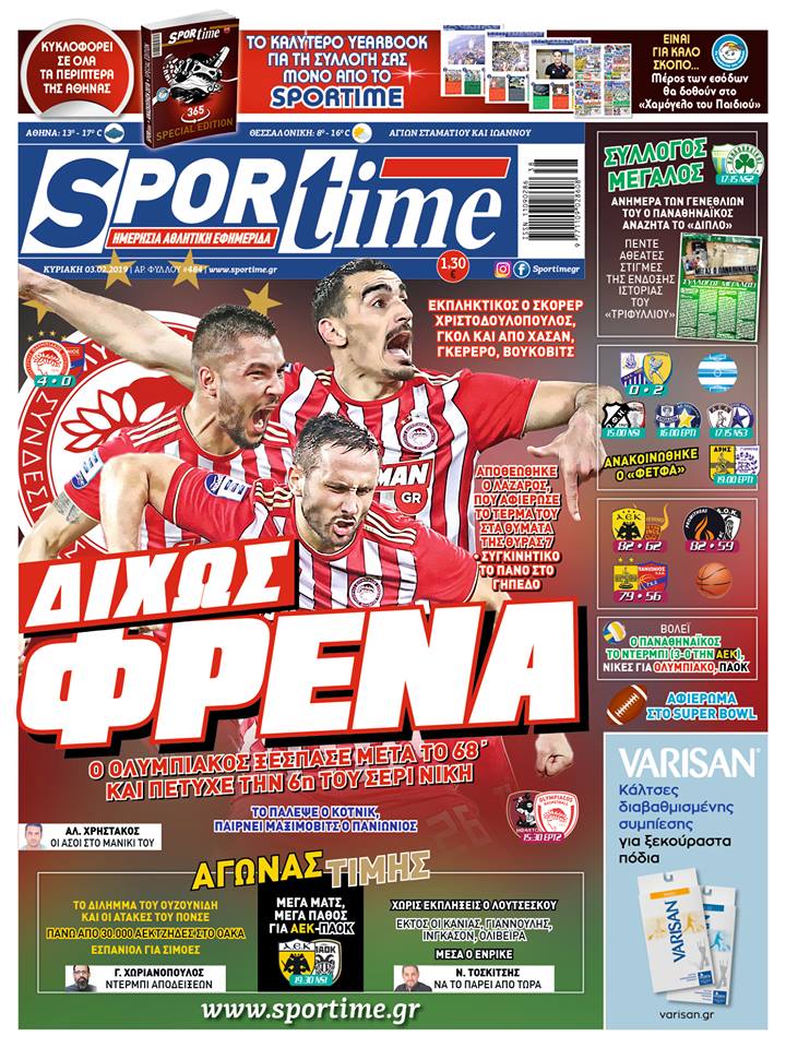 Διαβάστε σήμερα (3/2) στο Sportime: *Δίχως φρένα – Ο Ολυμπιακός ξέσπασε μετά το 68’ και πέτυχε την 6η του σερί νίκη – Εκπληκτικό ο σκόρερ Χριστοδουλόπουλος, γκολ και από Χασάν, Γκερέρο, Βούκοβιτς – Αποθεώθηκε ο Λάζαρος, που αφιέρωσε το τέρμα του στα θύματα της Θύρας 7 – Συγκινητικό πανό στο γήπεδο. *Σύλλογος μεγάλος – Ανήμερα...