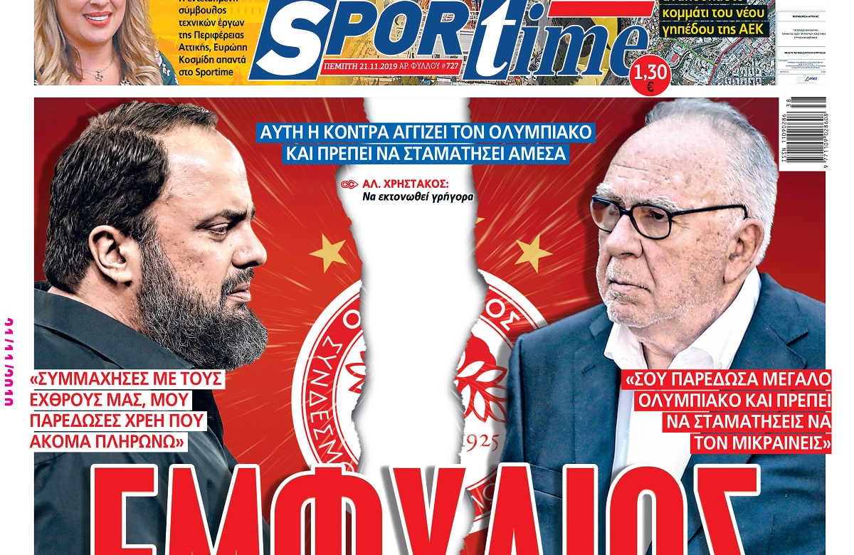 Το σημερινό (Πέμπτη 21 Νοεμβρίου) πρωτοσέλιδο του Sportime καταπιάνεται με τη διαμάχη του Βαγγέλη Μαρινάκη με τον Σωκράτη Κόκκαλη.