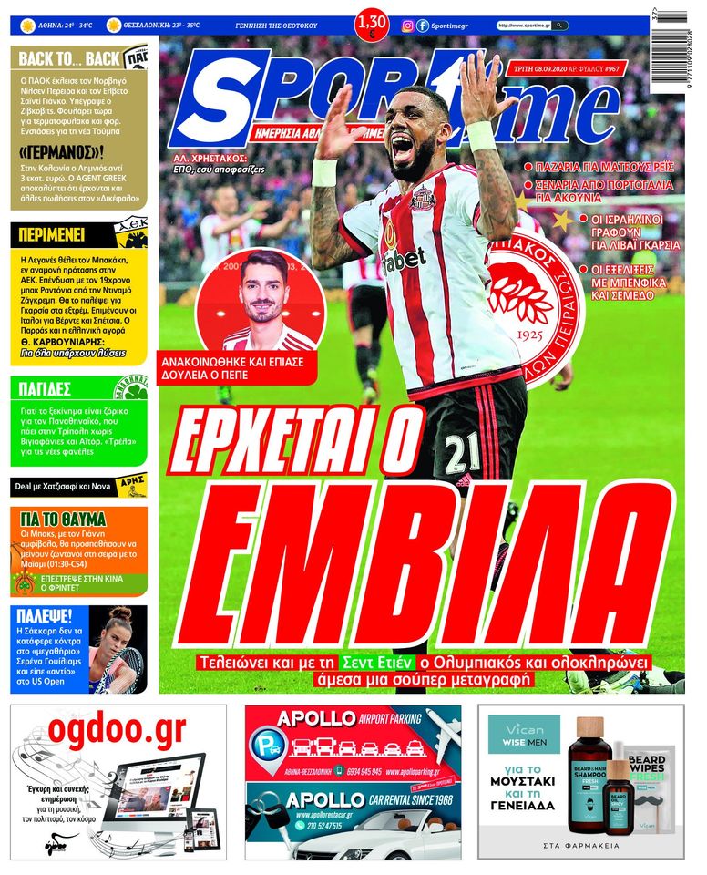Διαβάστε σήμερα (8/9) τι αναφέρει το πρωτοσέλιδο του Sportime, που έχει ως βασικό θέμα την περίπτωση του Εμβιλά.