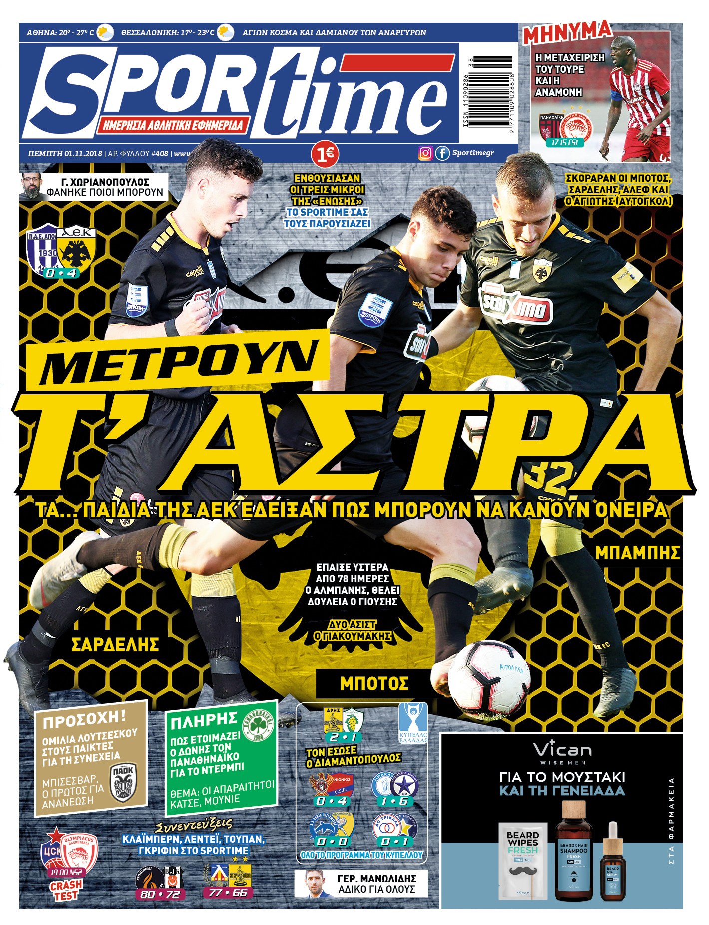 Διαβάστε σήμερα (1/11) στο Sportime: *Μετρούν τ’ άστρα – Τα… παιδιά της ΑΕΚ έδειξαν πως μπορούν να κάνουν όνειρα – Ενθουσίασαν οι τρεις μικροί της «Ένωσης», το Sportime σας τους παρουσιάζει – Σκόραραν οι Μπότος, Σαρδέλης, Άλεφ και ο Αγιώτης (αυτογκόλ) – Έπαιξε μετά από 78 ημέρες ο Αλμπάνης, θέλει δουλειά ο Γιούσης – Δύο...