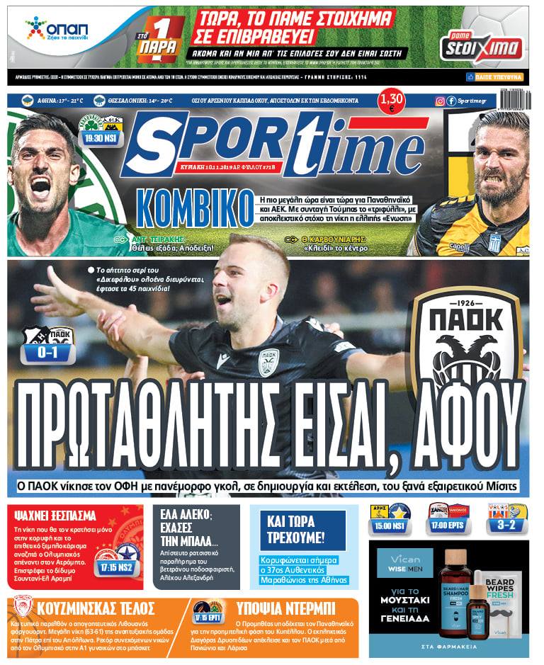 Διαβάστε τι αναφέρει το πρωτοσέλιδο του Sportime, που έχει ως πρώτο θέμα τη νίκη που πέτυχε ο ΠΑΟΚ μέσα στην έδρα του ΟΦΗ.