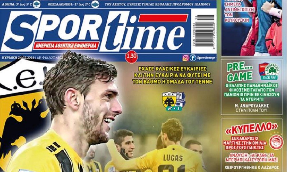 Διαβάστε σήμερα (24/2) στο Sportime: *Ψύχρα – Κακή η ΑΕΚ, κέρδισε με δύο γκολ του εξαιρετικού Μπογέ τον Απόλλωνα Σμύρνης – Έχασε κλασικές ευκαιρίες και την ευκαιρία να φύγει με τον βαθμό η ομάδα του Τεννέ – Καθοριστικό ο Τσιντώτας – Χιμένεθ: «Βαρέθηκε ο κόσμος» – Πρόβλημα με Μπακασέτα, Γαλανόπουλο. *Σούφος vs Παλτό – ΠΑΟΚ...