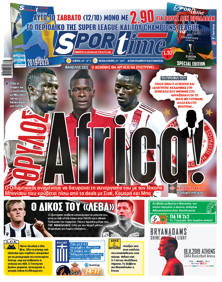 Διαβάστε σήμερα (10/10) τι αναφέρει το πρωτοσέλιδο του Sportime, που έχει σαν κεντρικό θέμα το «άρωμα» Αφρικής στο ρόστερ του Ολυμπιακού.