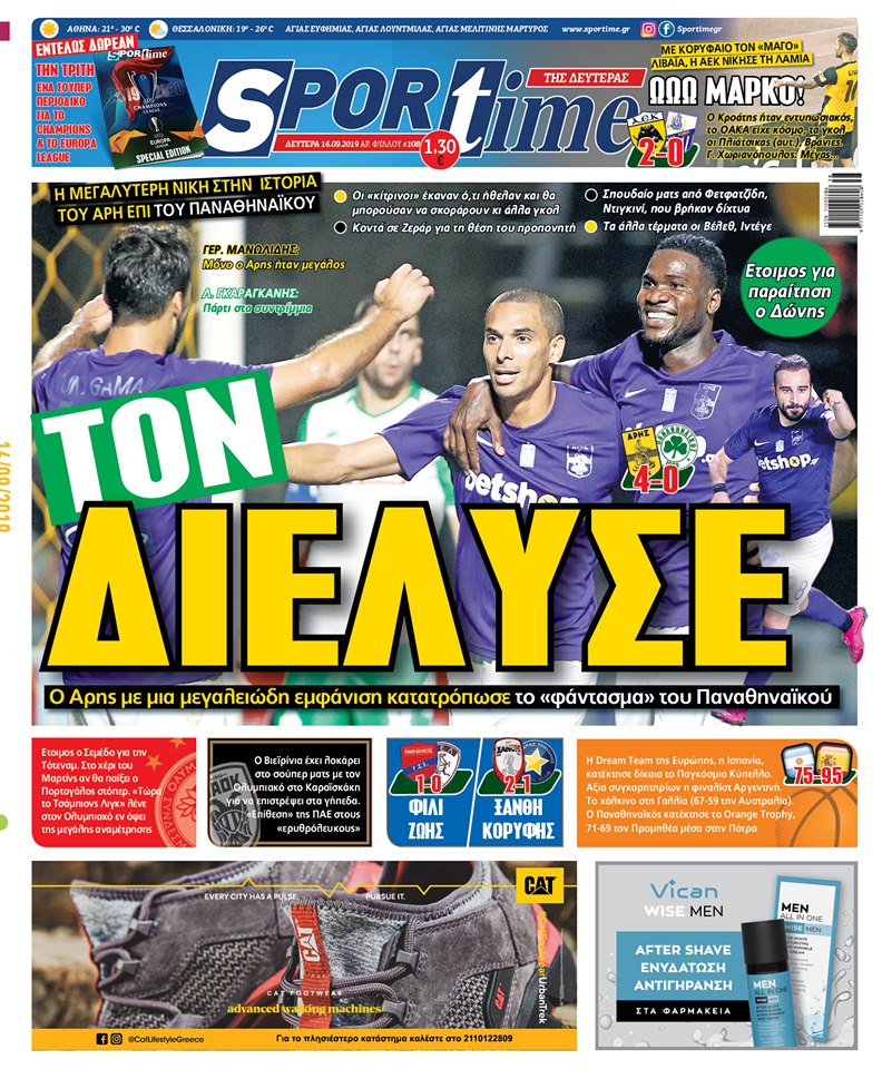 Διαβάστε σήμερα (16/9) τι αναφέρει το πρωτοσέλιδο του Sportime, που έχει ως κεντρικό θέμα τη μεγάλη νίκη του Άρη επί του Παναθηναϊκού.