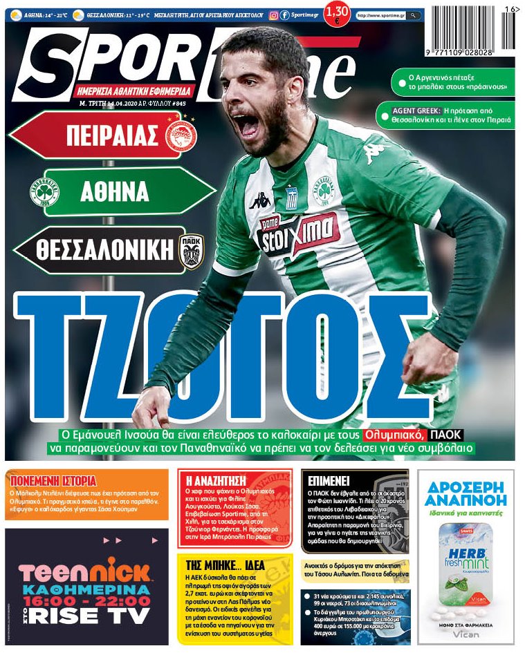 Διαβάστε τι αναφέρει σήμερα (14/4) το πρωτοσέλιδο του Sportime, που… τζογάρει για Ινσούα. Αναλυτικά: Τζόγος: Ο Εμάνουελ Ινσούα θα είναι ελεύθερος το καλοκαίρι με τους Ολυμπιακό, ΠΑΟΚ να παραμονεύουν και τον Παναθηναϊκό να πρέπει να τον δελεάσει για νέο συμβόλαιο. Ο Αργεντίνος πέταξε το μπαλάκι στους «πράσινους». AGENT GREEK: Η πρόταση από Θεσσαλονίκη και τι...