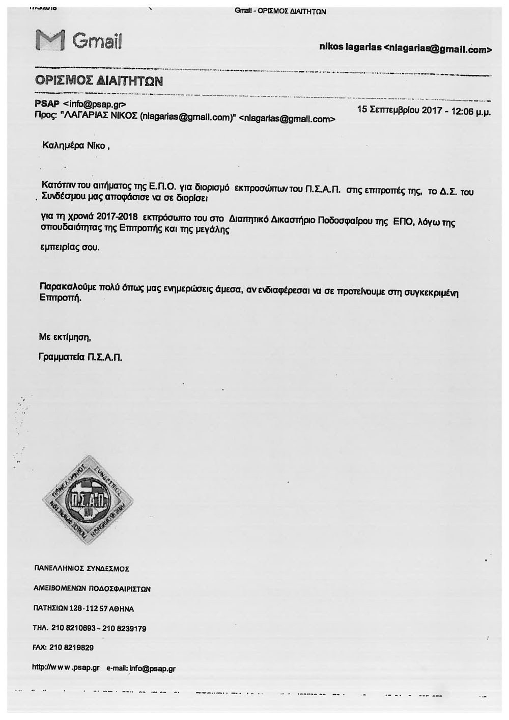«Καλημέρα Νίκο, κατόπιν του αιτήματος της ΕΠΟ για διορισμό εκπροσώπων του ΠΣΑΠ στις επιτροπές της, το Δ.Σ. του Συνδέσμου μας αποφάσισε να σε διορίσει για τη χρονιά 2017-2018 εκπρόσωπό του στο Διαιτητικό Δικαστήριο Ποδοσφαίρου της ΕΠΟ, λόγω της σπουδαιότητας της Επιτροπής και της μεγάλης εμπειρίας σου. Παρακαλούμε πολύ όπως μας ενημερώσεις άμεσα, αν ενδιαφέρεσαι να σε προτείνουμε στη συγκεκριμένη Επιτροπή».