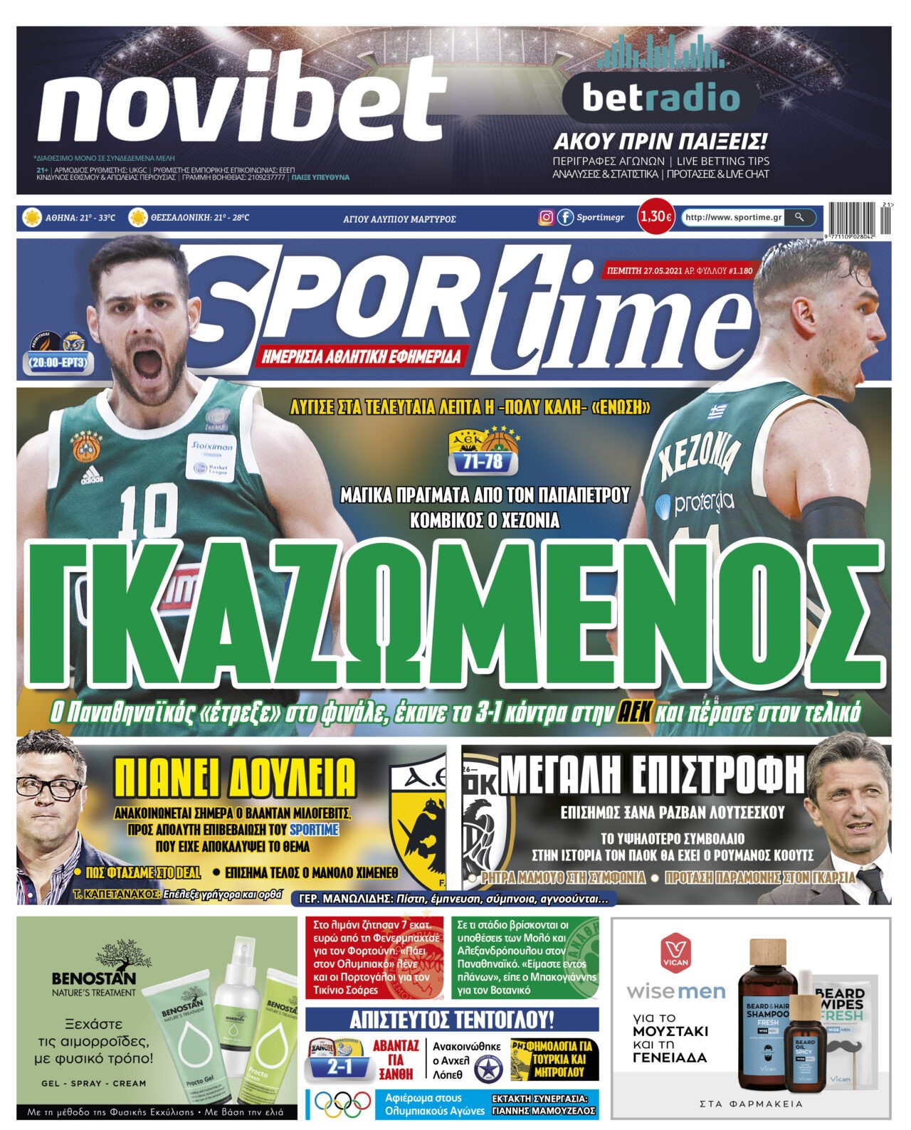 Sportime-Έντυπη έκδοση (27/5): Στον τελικό της Basket League ο Παναθηναϊκός, επίσημα Λουτσέσκου στον ΠΑΟΚ, ανακοινώνει Μιλόγεβιτς η ΑΕΚ.