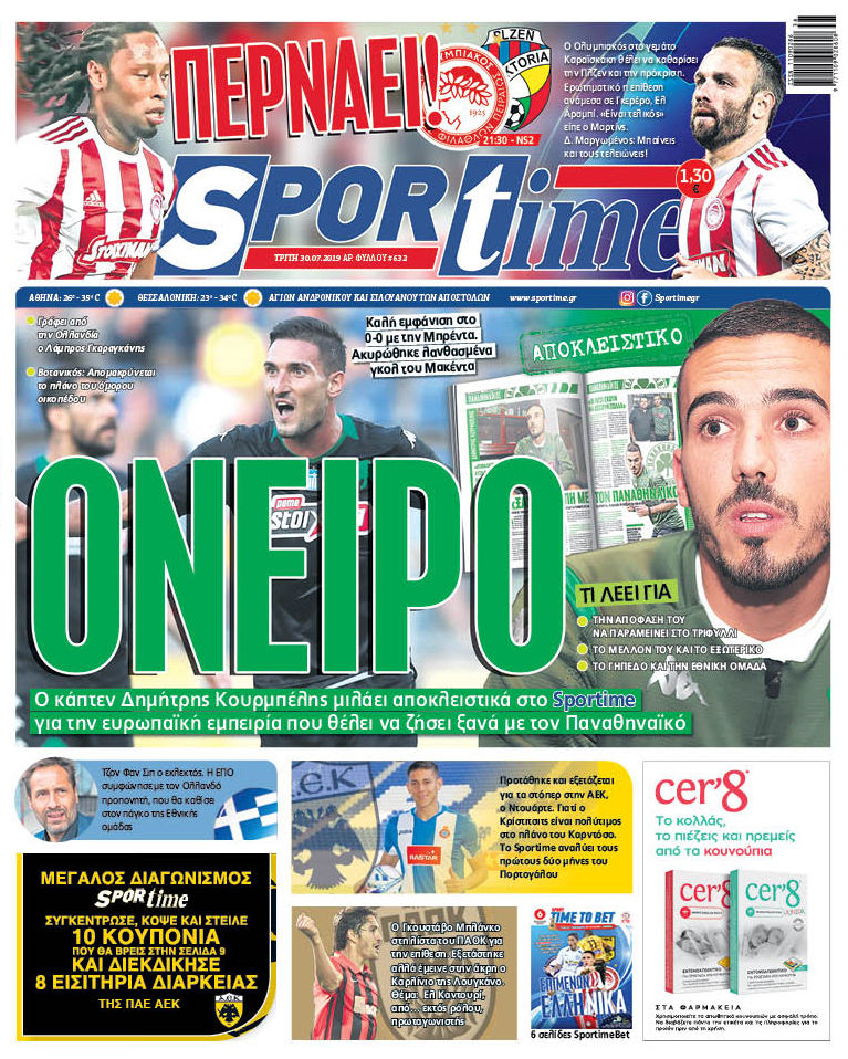Διαβάστε τι αναφέρει σήμερα (30/7) το πρωτοσέλιδο του Sportime, που έχει ως πρώτο θέμα την αποκλειστική συνέντευξη του Δημήτρη Κουρμπέλη στο Sportime.