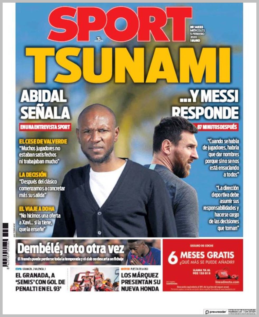 Οι κατηγορίες του Ερίκ Αμπιντάλ, σχετικά με παίκτες της Μπαρτσελόνα, που δεν προσπαθούσαν σκληρά στις προπονήσεις μετά το clasico δημιούργησε εμφύλιο στους μπλαουγκράνα. Όπως είναι λογικό, μονοπωλεί το ενδιαφέρον στον ισπανικό Τύπο.