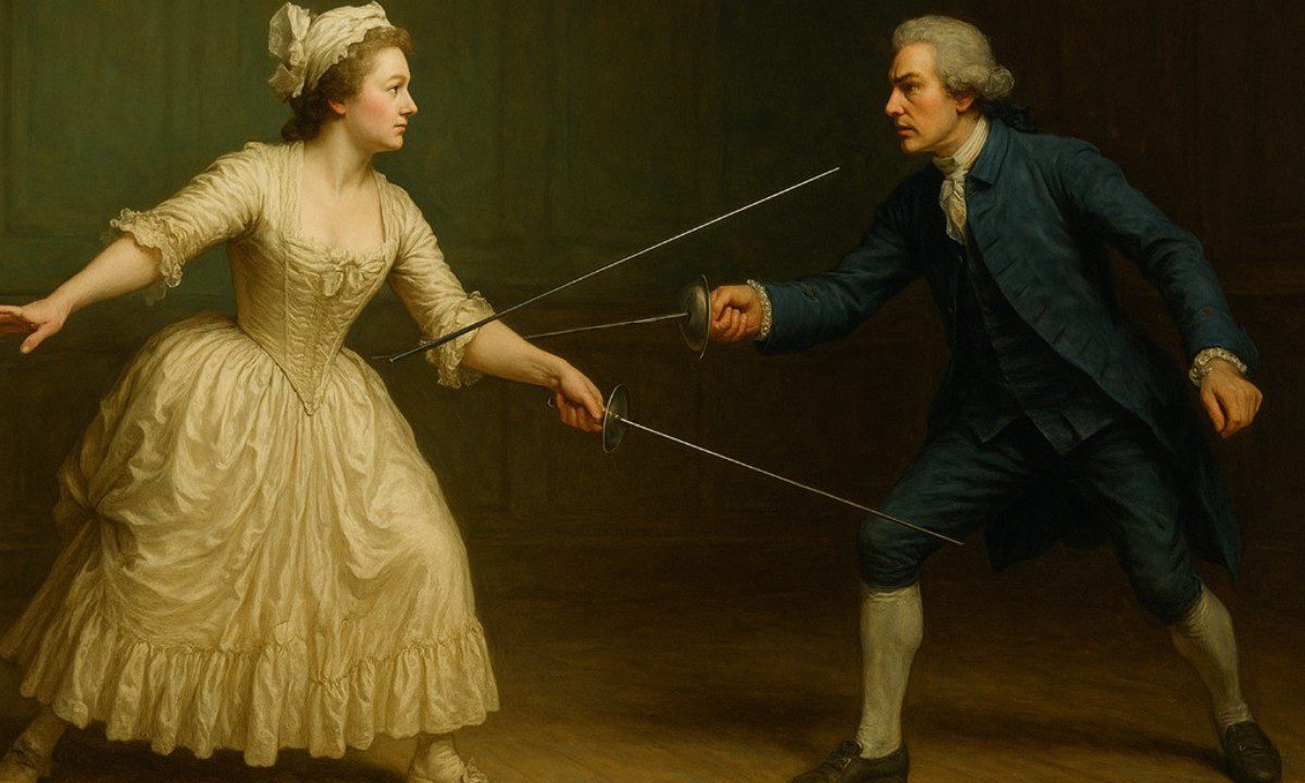 Θέλεις συνοδευτική εικόνα ξιφομαχίας με φόρεμα, εποχής 18ου αιώνα; Πες μου να τη δημιουργήσω.