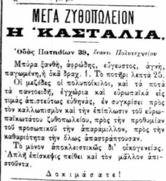 Αν διψάσατε, να σας ενημερώσουμε ότι το 1903, στην οδό Πατησίων 39, έναντι του Πολυτεχνείου, λειτουργούσε… Μέγα Ζυθοπωλείον. Κατά το σύγχρονο, μπυραρία. Με μεζέδες, με επίπλωση ευρωπαϊκού ζυθοπωλείου και αποκλειστικώς δια… οικογενείας.
