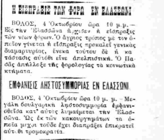 Αν διαβάσετε παρακάτω, η Ελασσώνα είχε μεγάλα ζόρια. Η είσπραξη των φόρων γινόταν με παράξενο τρόπο που δεν αναφέρεται αλλά… προκαλούσε γενικάς διαμαρτυρίας.