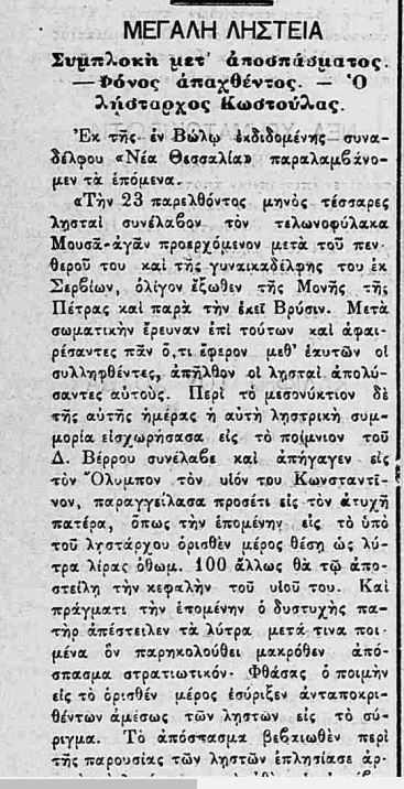 Οι λήσταρχοι τρομοκρατούσαν τους Ελληνες. Και το 1895, ο λήσταρχος Κωστούλας, αφενός μεν λήστεψε έναν τελωνοφύλακα και μέλη της οικογενείας του, αφετέρου δε απήγαγε, με τη συμμορία του τον Κωνσταντίνο Βέρρο. Ηταν γιός ενός βοσκού. Και ζήτησε από τον πατέρα του απαχθέντος, 100 οθωμανικές λίρες ως την επόμενη μέρα. Αλλιώς θα έκοβε το κεφάλι του γιού…