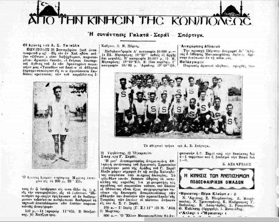 Συγκινητικό… Η εφημερίδα παρουσιάζει την αθλητική κίνηση των Ελλήνων της Κωνσταντινούπολης, το 1928. Στην ομαδική φωτό οι αθλητές του Σπόρτιγκ. Αριστερά, ο άριστος δρομεύς (όπως περιγράφεται) Μαρίνος που πρώτευσε στους αγώνες Ούνιον Καπ της Χαλκηδόνας.