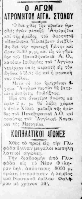 Διάφορες αθλητικές ειδήσεις της εποχής. Ο αγώνας του ατρομήτου με ομάδα του αγγλικού στόλου και κωπηλατικοί αγώνες από την Γλυφάδα ως το Νέο Φάληρο.