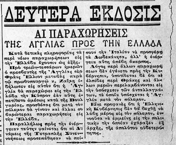 Το 1915 και στη διάρκεια του Α’ Παγκοσμίου πολέμου, οι Αγγλοι ζητούν επιτακτικά από την Ελλάδα να επιτεθεί στην Βουλγαρία. Να μπει στον πόλεμο δηλαδή. Μάλιστα όπως αναφέρει το ρεπορτάζ, οι Αγγλοι έταζαν την… Κύπρο, καθώς η Μεγαλόνησος ήταν από αγγλική κυριαρχία. Επίσης οι Ελληνες είχαν ελπίδες και για την Θράκη ενώ οι Αγγλοι έλεγαν ότι ήθελαν να δώσουν στην Ελλάδα τα Δωδεκάνησα, αλλά οι Ιταλοί δεν δέχονταν….