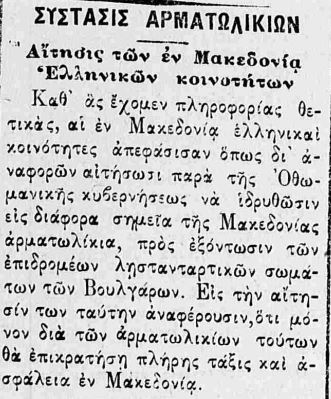 Αλλη μια είδηση της εποχής. Οι ελληνικές κοινότητες της Μακεδονίας ζήτησαν από την Οθωμανική Κυβέρνηση να φτιάξει αρματωλίκια ώστε να εξοντωθούν οι ληστανταρτικές συμμορίες των Βουλγάρων. Βεβαίως το 1896 η Μακεδονί ήταν υπό Οθωμανική κυριαρχία.