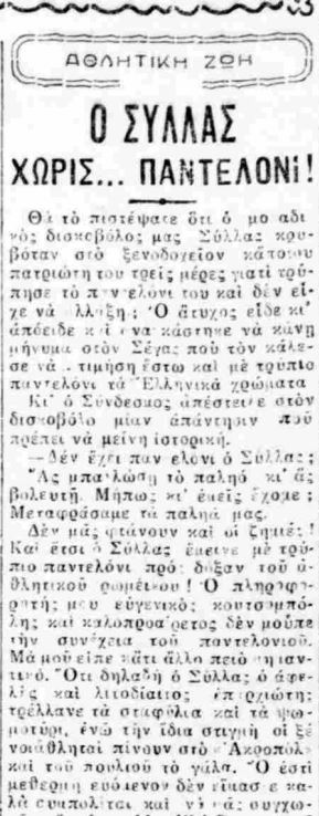 Εδώ έχουμε ένα ευτράπελο που φανερώνει τις δυσκολίες της εποχής. Ο μοναδικός δισκοβόλος μας στους Βαλκανικούς του 1933, Σύλλας, κρυβόταν επί τρεις μέρες στο ξενοδοχείο κάποιου συμπατριώτη του γιατί είχε… τρυπήσει το παντελόνι του και δεν είχε να αλλάξει. Μάλιστα όταν έστειλε μήνυμα στον ΣΕΓΑΣ η απάντηση ήταν αφοπλιστική. Να το μπαλώσει κι εμείς το ίδιο κάναμε με τα δικά μας. Κι έτσι εμφανίστηκε με… τρύπιο παντελόνι…