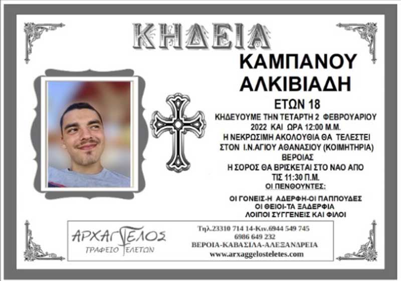 Η κηδεία του αδικοχαμένου Αλκιβιάδη θα γίνει την Τετάρτη 2 Φεβρουαρίου 2022, στο Ναό Αγ. Αθανασίου (Κοιμητήρια) Βέροιας.