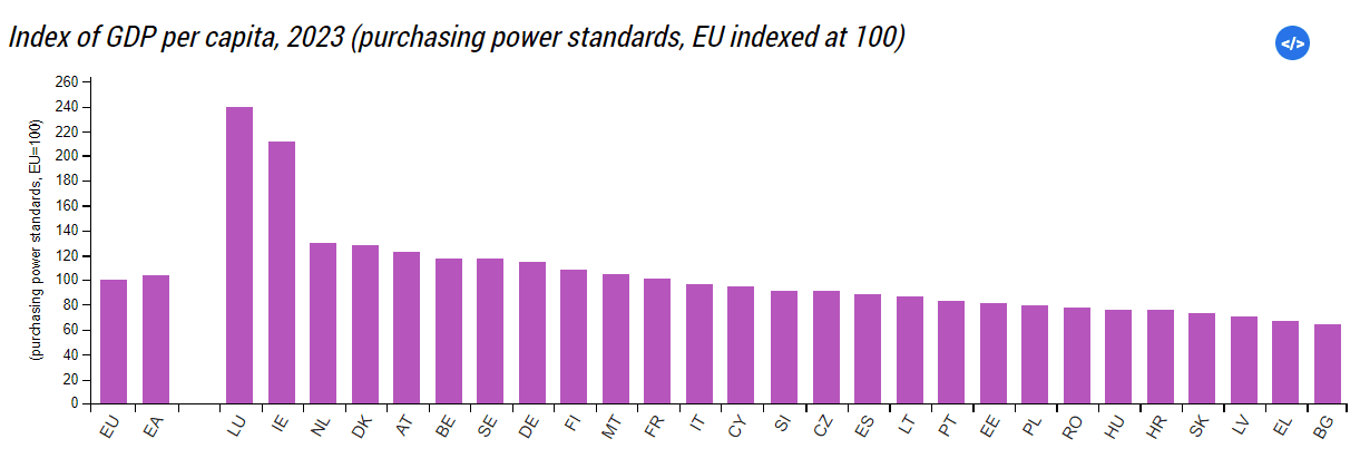 Όπως επισημαίνεται στην έρευνα της Eurostat, η Ελλάδα βρίσκεται στην προτελευταία θέση της ΕΕ των 27 το 2023 όσον αφορά το κατά κεφαλήν Ακαθάριστο Εγχώριο Προϊόν, με επίδοση στο 67% του μέσου όρου της ΕΕ, με τη Βουλγαρία να είναι η μοναδική χώρα με χαμηλότερη επίδοση, στο 64%. Όταν κάποιοι στα χρόνια των μνημονίων μιλούσαν για «βουλγαροποίηση» της Ελλάδας, αντιμετωπίζονταν ως γραφικοί. Και σήμερα έχει γίνει ακριβώς αυτό.