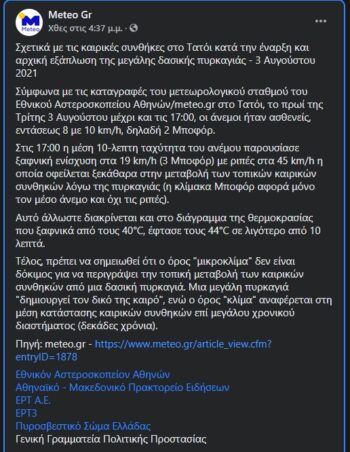 Ενώ με σαφή τρόπο, το Εθνικό Αστεροσκοπείο Αθηνών, διορθώνει τον Νίκο Χαρδαλιά και όσους πολιτικούς και δημοσιογράφους μεταχειρίζονται με τόση ευκολία τη λέξη «μικροκλίμα» (που έχει γίνει μία από τις αγαπημένες «καραμέλες» των τελευταίων ημερών), υπογραμμίζοντας πως ο όρος «κλίμα» σημαίνει κάτι διαφορετικό, και δεν είναι ορθό να χρησιμοποιείται για μια πυρκαγιά που ενδεχομένως «δημιουργεί τον δικό της καιρό».