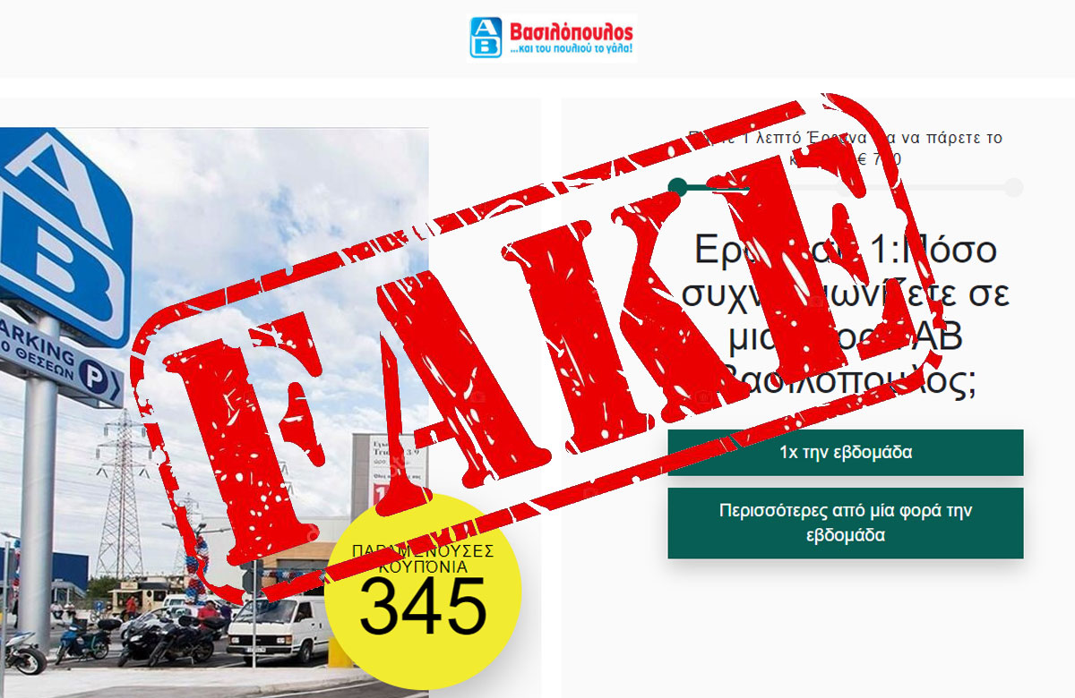 Το τελευταίο περιστατικό έχει να κάνει με κουπόνια της ΑΒ Βασιλόπουλος που θα κερδίσουν όσοι συμμετάσχουν σε μία «έρευνα» και απαντήσουν σε κάποιες ερωτήσεις.