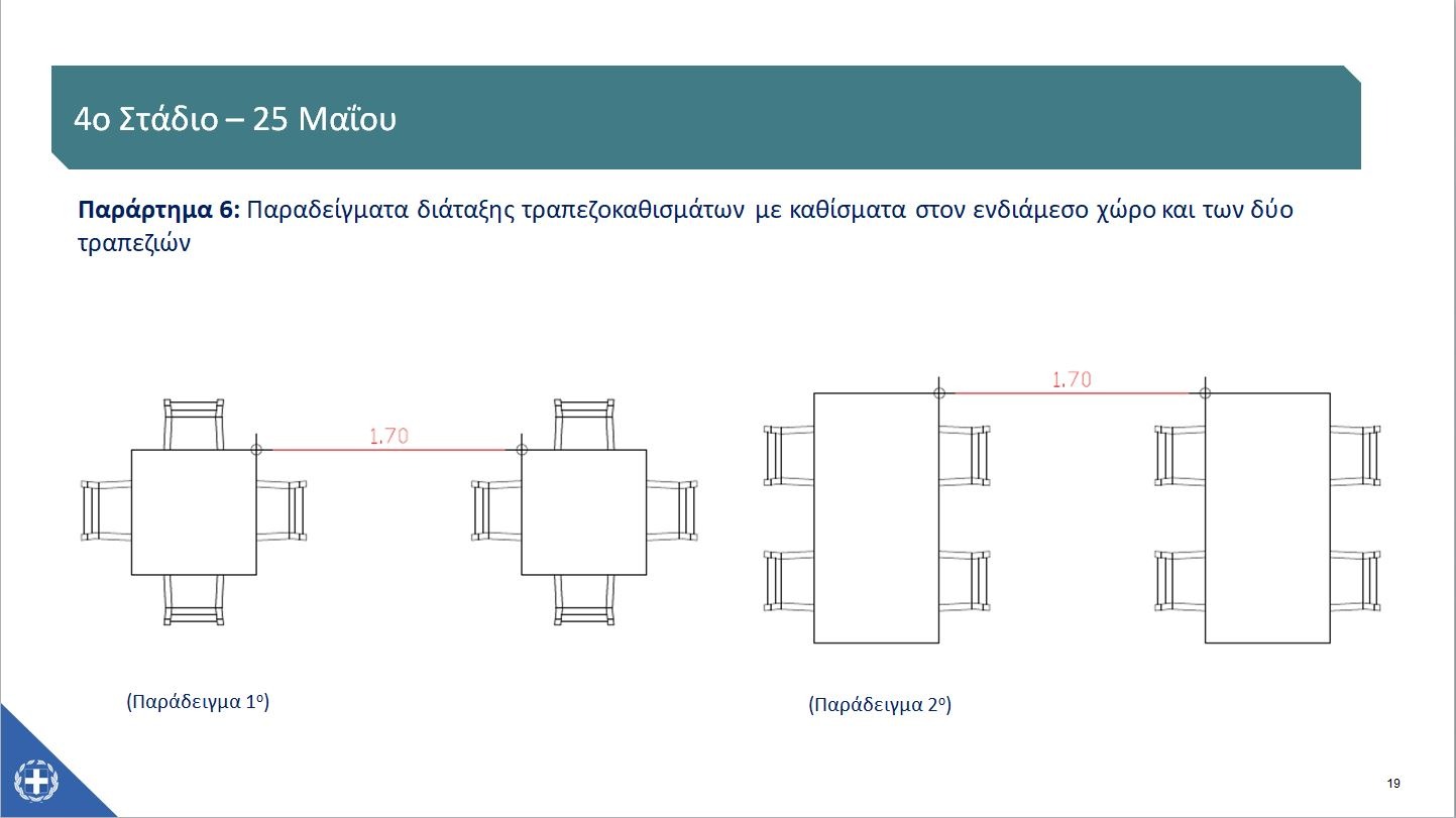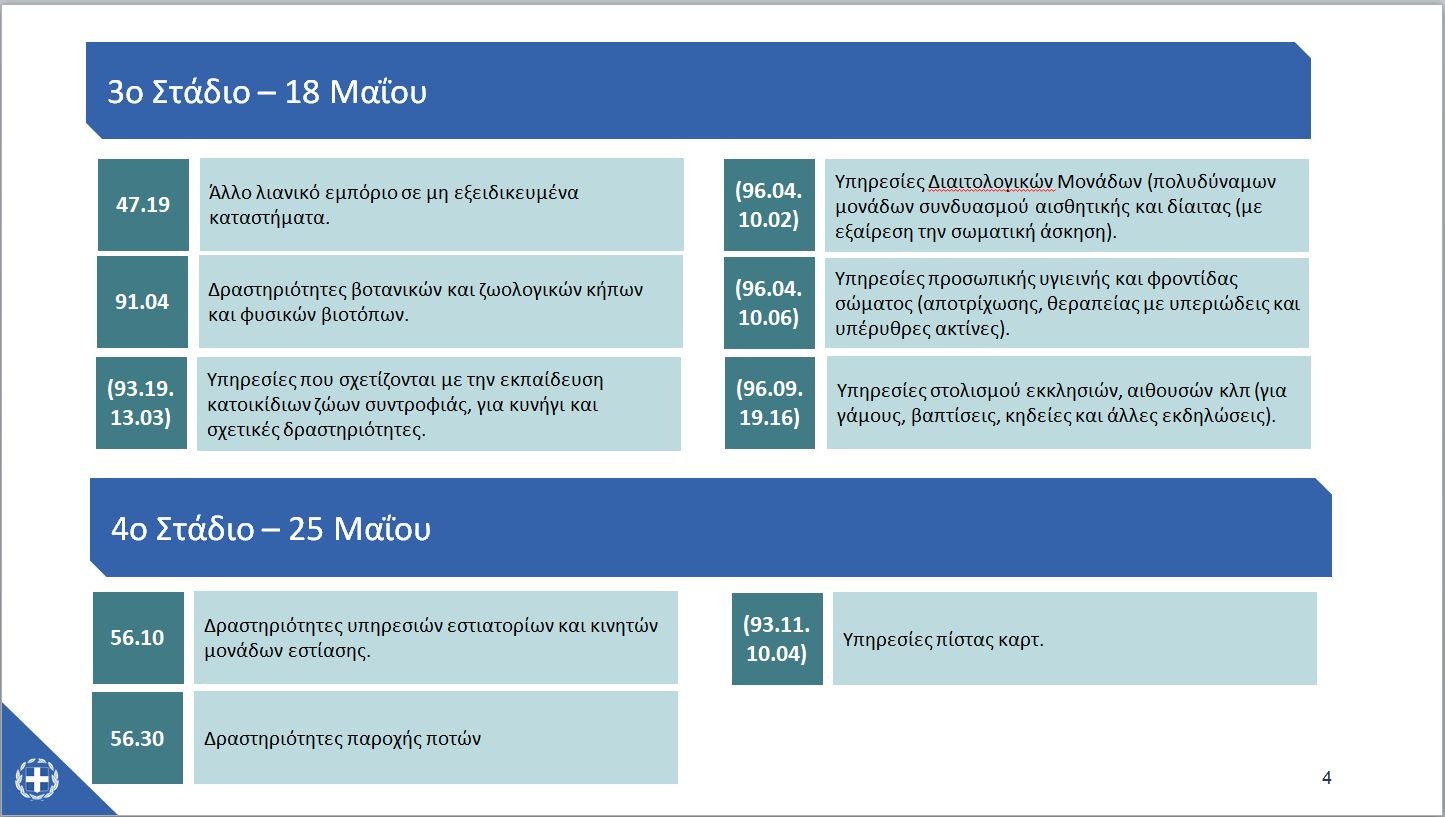 Συνεχίζοντας, σας γνωστοποιούμε τις οικονομικές δραστηριότητες που επανεκκινούν κατά το 4ο στάδιο επαναφοράς, δηλαδή τη Δευτέρα 25 Μαΐου, καθώς και τους κανόνες λειτουργίας τους.