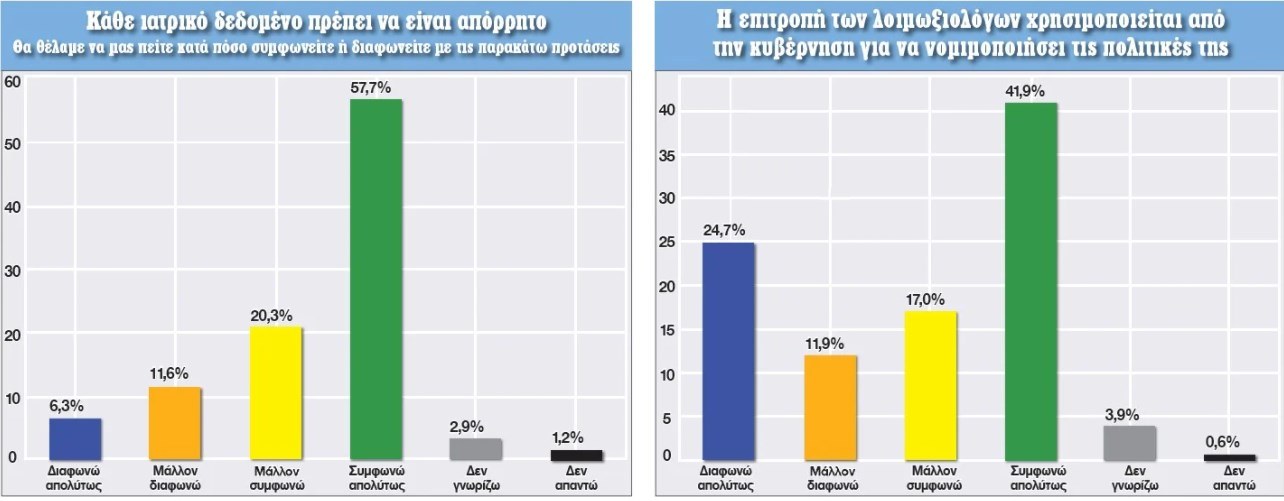 Έντονα αμφισβητείται από τους πολίτες ο ρόλος της επιτροπής λοιμωξιολόγων, σύμφωνα με τα ευρήματα της δημοσκόπησης. Οι απαντήσεις των πολιτών ως προς το εάν συμφωνούν ή διαφωνούν με την πρόταση «η επιτροπή των λοιμωξιολόγων χρησιμοποιείται από την κυβέρνηση για να νομιμοποιήσει τις πολιτικές της» αποκαλύπτουν ότι στην κοινή γνώμη κυριαρχεί η άποψη πως η επιτροπή λοιμωξιολόγων δεν αποτελεί τίποτε άλλο παρά μία βιτρίνα, προκειμένου η κυβέρνηση να μπορεί να επιβάλλει τις δικές της επιλογές.