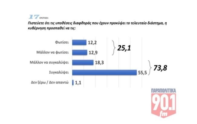Πριν δύο εβδομάδες μια δημοσκόπηση της Alco είχε δείξει σε επί μέρους ερώτημα ότι οι 7 στους 10 πολίτες ταυτίζουν την κυβέρνηση Μητσοτάκη με τις λέξεις «διαφθορά», «συγκάλυψη» και «αναποτελεσματικότητα». Επικυρώνοντας απόλυτα το εύρημα της Alco, στη δημοσκόπηση της GPO και πάλι οι 7 στους 10 πολίτες ήτοι το 73,8% των ερωτηθέντων, απάντησε ότι η κυβέρνηση προσπαθεί να συγκαλύψει τις υποθέσεις διαφθοράς που έχουν προκύψει το τελευταίο διάστημα.