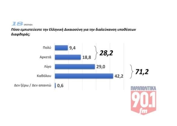 Το 71,2% των ερωτηθέντων δήλωσε ότι εμπιστεύεται λίγο (29%) ή καθόλου (42,2%) την ελληνική δικαιοσύνη. Κι εδώ η ταύτιση κυβέρνησης – δικαιοσύνης στα ποσοστά αποδοκιμασίας, αποκαλύπτει πολλά για τη γνώμη που φέρουν οι πολίτες για το κατά πόσο ανεξάρτητη είναι η δικαιοσύνη. Στον αντίποδα, οι πολίτες έδειξαν ότι σε ποσοστό 61% εμπιστεύονται πολύ (18,4%) ή αρκετά (42,6%) την Ευρωπαϊκή Εισαγγελία.