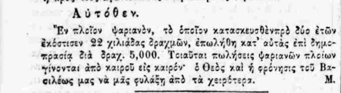 Η επόμενη είδηση αφορά πώληση πλοίου. Το οποίο είχε κατασκευαστεί το 1840 (δύο χρόνια νωρίτερα) και είχε κοστίσει 22 χιλιάδες δραχμές και πουλήθηκε σε δημοπρασία αντί… πέντε χιλιάδων δραχμών. Ο συντάκτης εύχεται να φυλάξει από τα χειρότερα τον κόσμο τόσο ο Θεός όσο και η… φρόνηση του Βασιλιά!