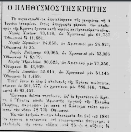 Συνολικά το 1902 ο πληθυσμός της Κρήτης ήταν 301.577 άνθρωποι. Οι 286.146 ήταν Χριστιανοί και οι Οθωμανοί 83.432. Επίσης από τη στιγμή που εγκαταστάθηκε στην Κρήτη ο Πρίγκηπας Γεώργιος, εγκατέλειψαν την Κρήτη 42.775 Οθωμανοί!!!
