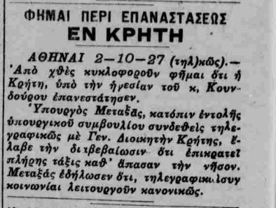 Διαδόθηκε φήμη ότι στις 2/10/1927 υπήρξε επανάσταση στην Κρήτη υπό τον Κούνδουρο. Ομως η επικοινωνία του τότε Υπουργού Ιωάννη Μεταξά (του γνωστού) αποκατέστησε την αλήθεια. Ήταν απλώς, φήμη.