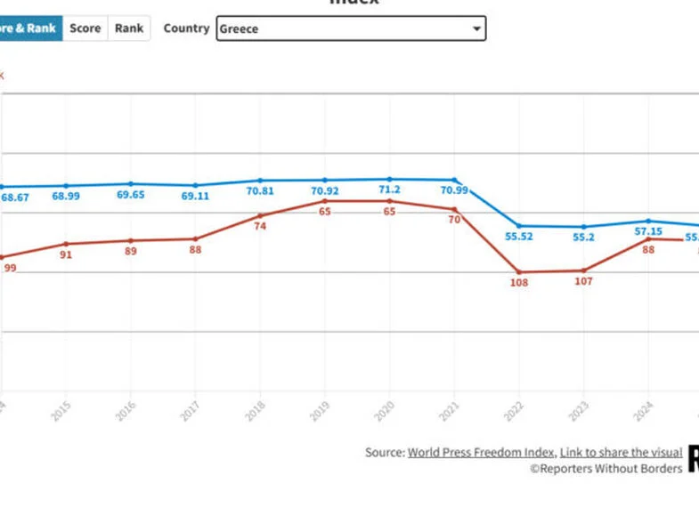 Συγκεκριμένα, σύμφωνα με την ετήσια παγκόσμια κατάταξη για το 2025 των Ρεπόρτερ Χωρίς Σύνορα (RSF), η Ελλάδα κατατάσσεται στην 89η θέση της λίστας, κάτι που την καθιστά (για άλλη μια χρονιά) χειρότερη χώρα της ΕΕ στην Ελευθερία του Τύπου. Μάλιστα η χώρα μας υποχώρησε κατά μία θέση σε σχέση με πέρυσι (88η θέση).