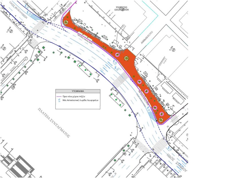 Πιο συγκεκριμένα, όσον αφορά στις παρεμβάσεις του Δήμου Αθηναίων, στο οδικό τμήμα που συνδέει την οδό Σταδίου (διασταύρωση με Καραγιώργη Σερβίας) με την οδό Φιλελλήνων (διασταύρωση με Μητροπόλεως), προεκτείνεται το πεζοδρόμιο. Κατ’ αυτό τον τρόπο, αποδίδονται στους πεζούς δύο επιπλέον λωρίδες. Πρόβλεψη για τη συνέχιση της ειδικής λωρίδας για ποδηλάτες δεν υπάρχει στο συγκεκριμένο οδικό τμήμα.
