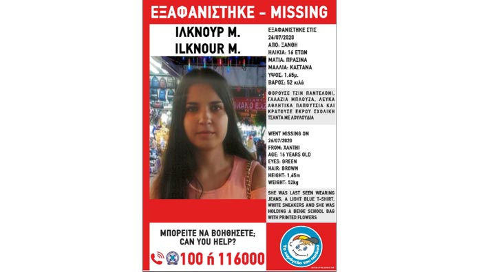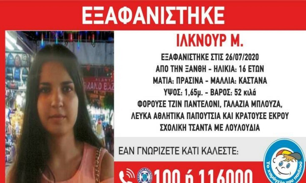 Πρόκειται για την Ιλκνούρ Μ., 16 ετών η οποία εξαφανίστηκε από το σπίτι της στην περιοχή της Ξάνθης στις 7 το πρωί της Κυριακής 26 Ιουλίου.