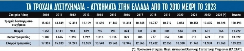 Από το 2010 μέχρι και τον Νοέμβριο του 2023 κατεγράφησαν 160.493 τροχαία δυστυχήματα και ατυχήματα, με απώλειες που μόνο σε έναν πόλεμο ή μια μεγάλη φυσική καταστροφή θα συναντούσε κάποιος. Ο βαρύς φόρος αίματος μετρά 11.222 ανθρώπους που πήγαιναν κάπου και δεν έφτασαν ποτέ. Από το 2010, οι βαριά τραυματίες (πολλοί από αυτούς απέκτησαν μόνιμες αναπηρίες) ανήλθαν στους 133.222 και οι ελαφρά τραυματίες στους 183.828.